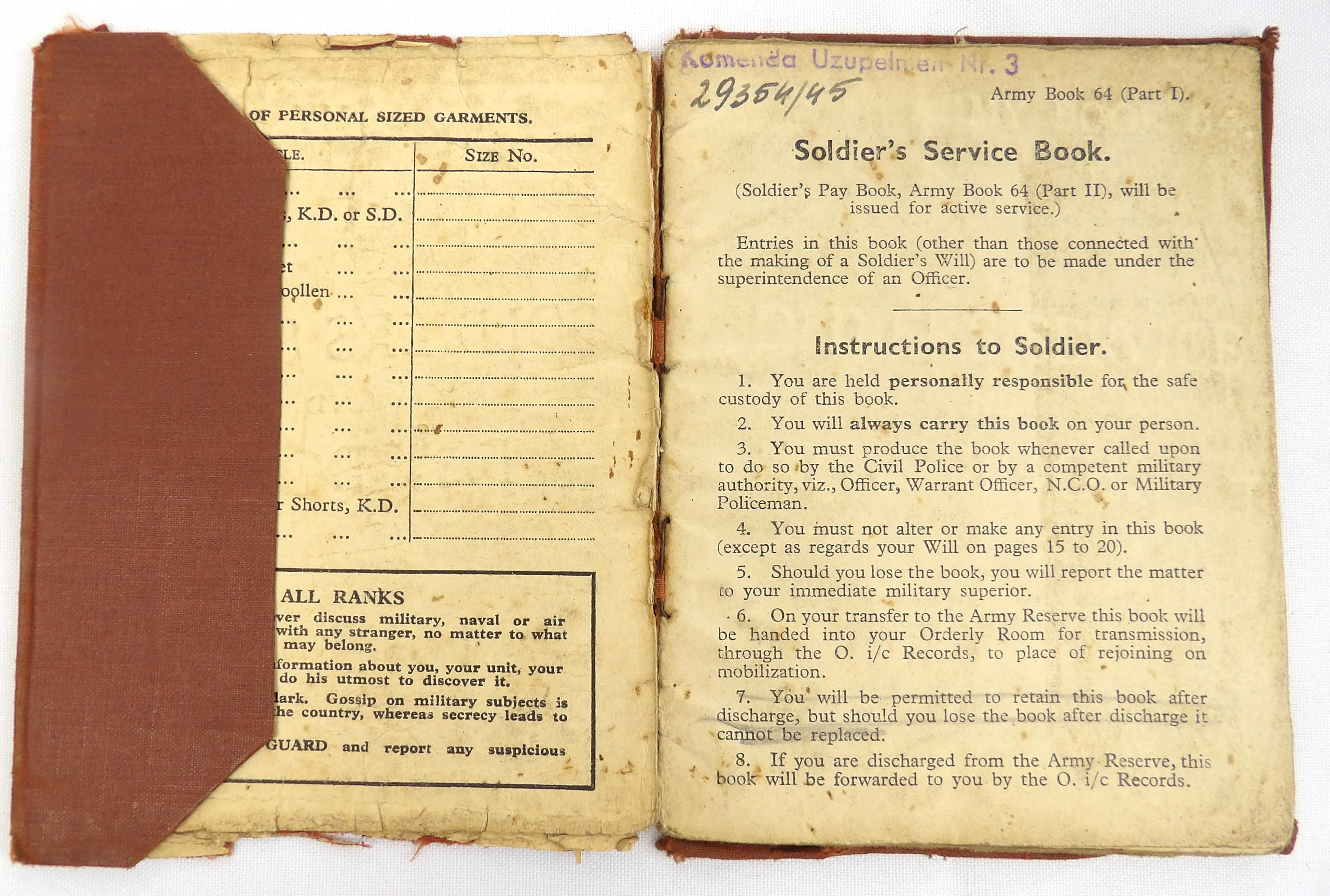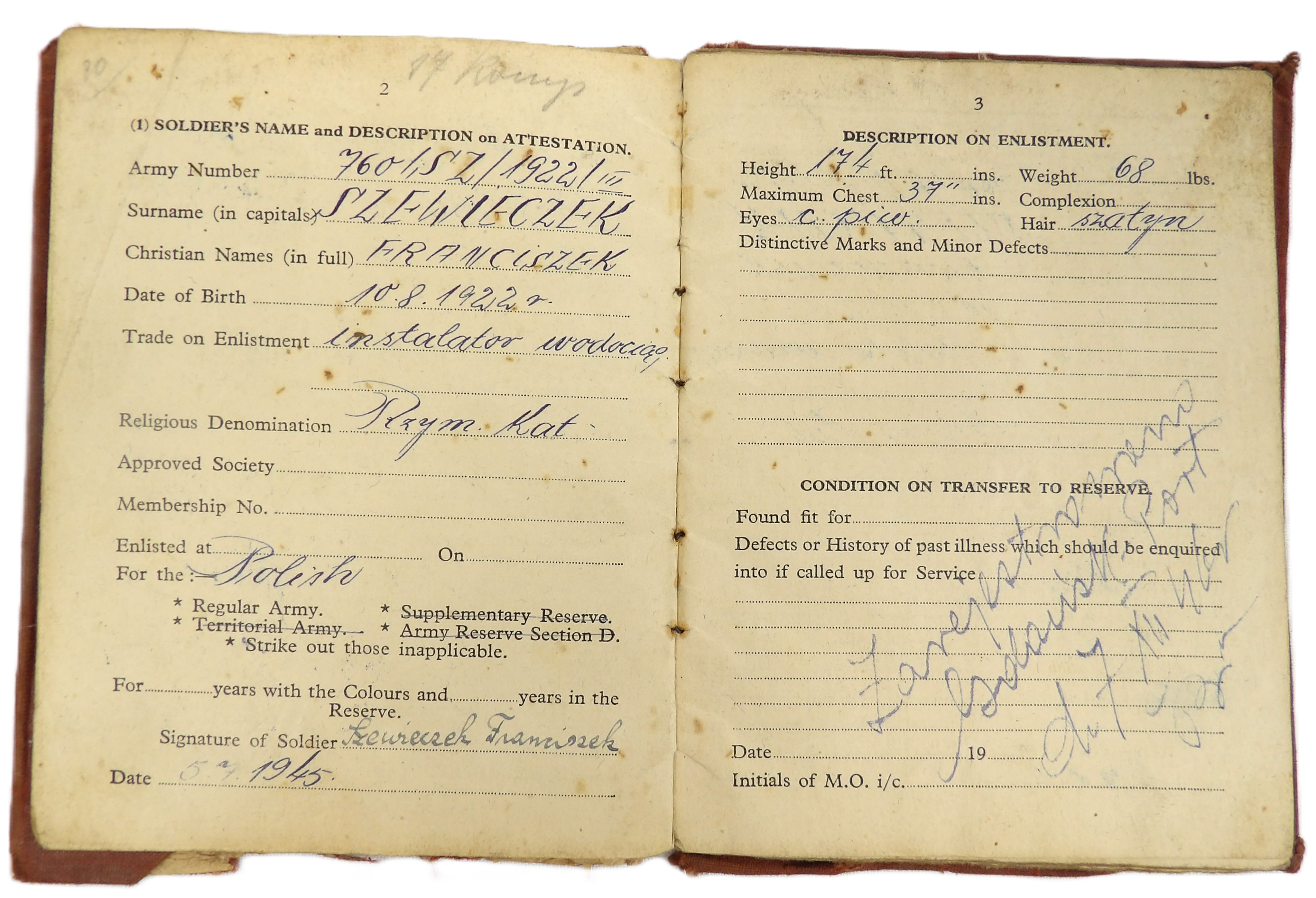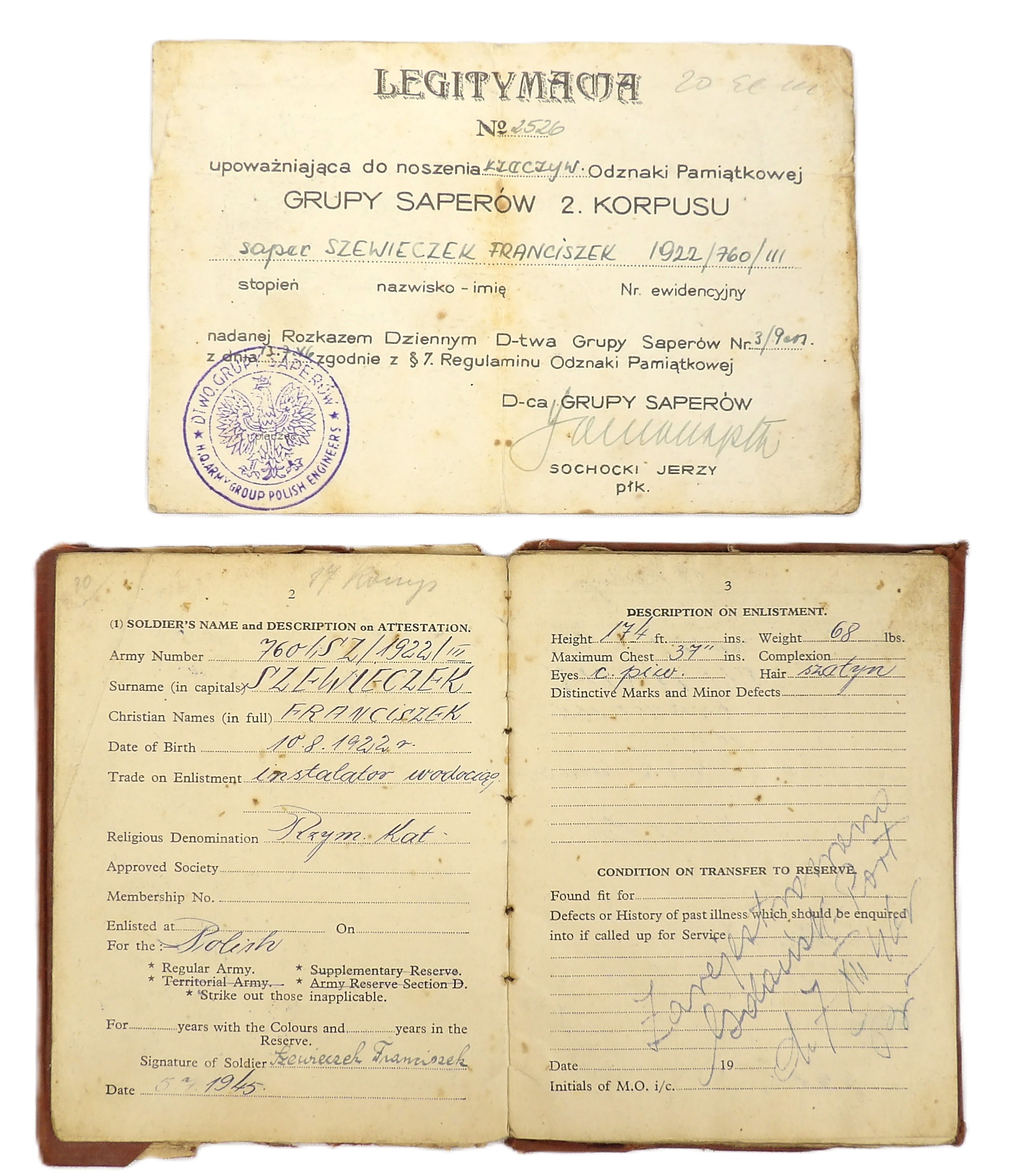 Legitymacja do odznaki wraz książeczką wojskową wstawioną dla tego samego żołnierza. Widoczne zabrudzenia oraz ślady zagięć.
