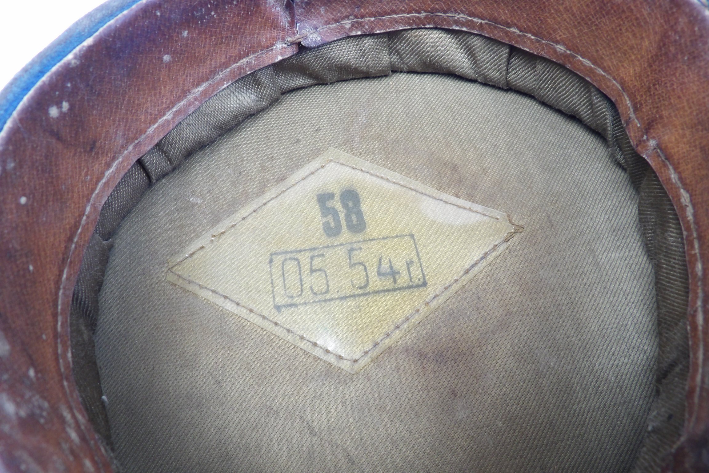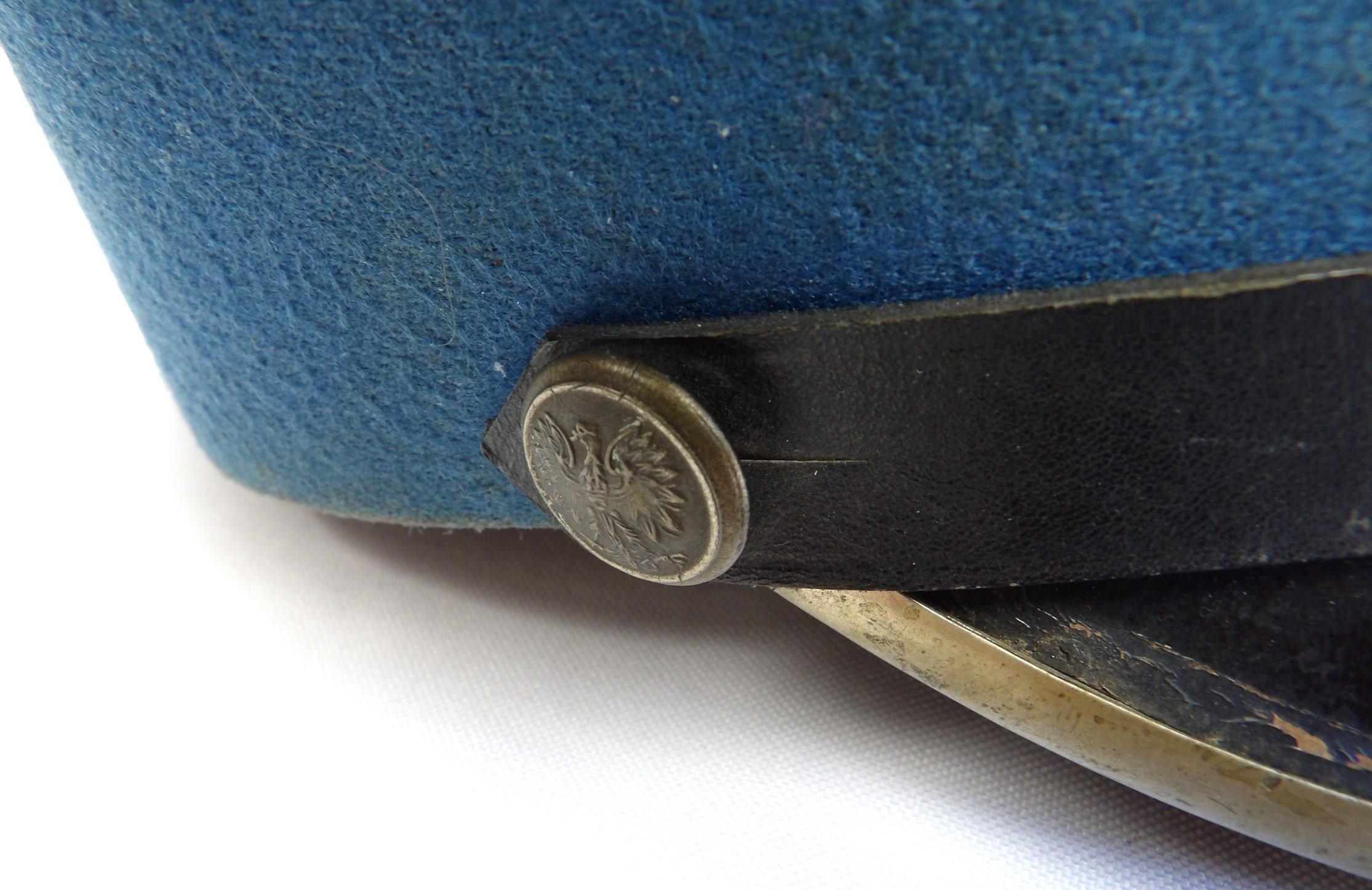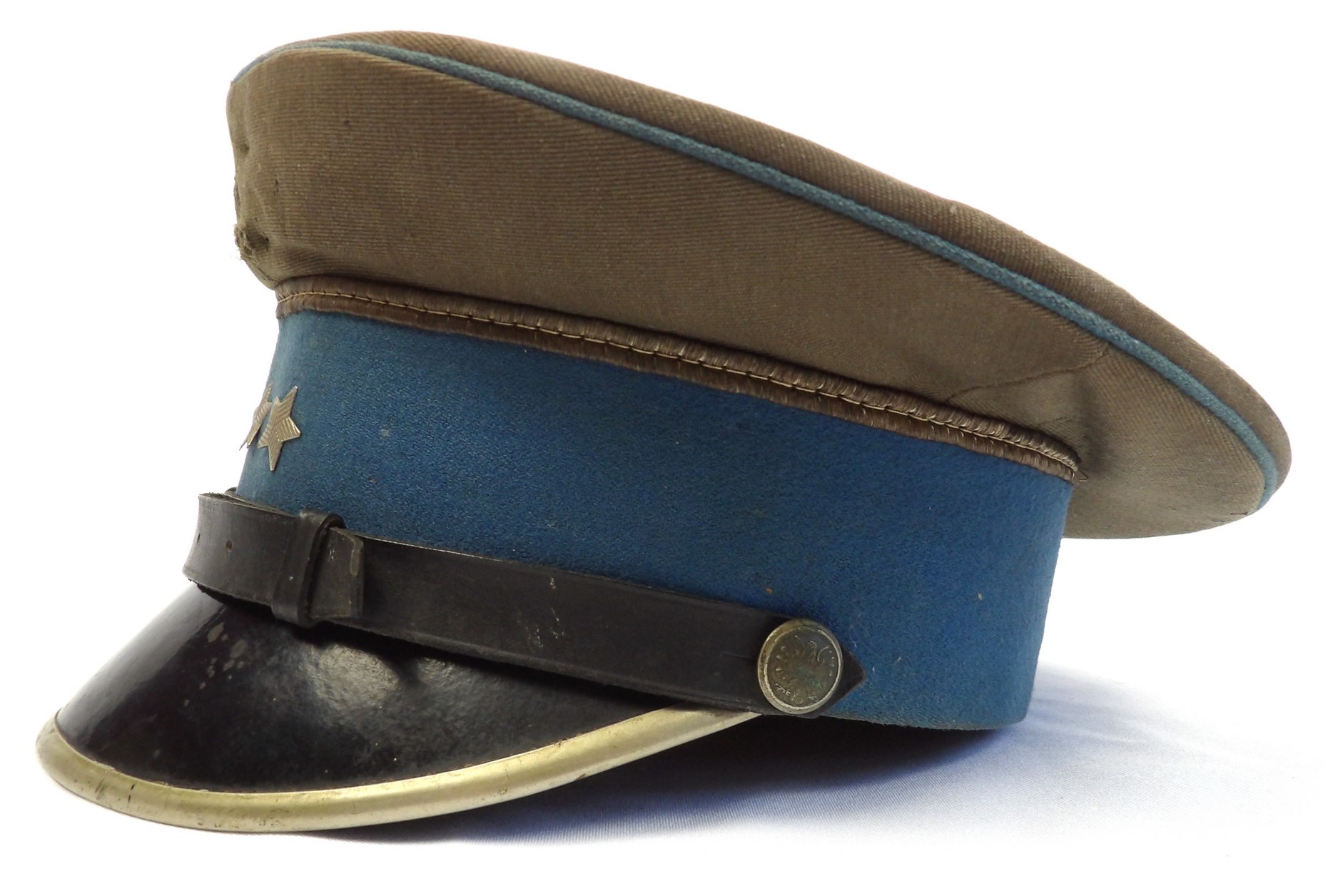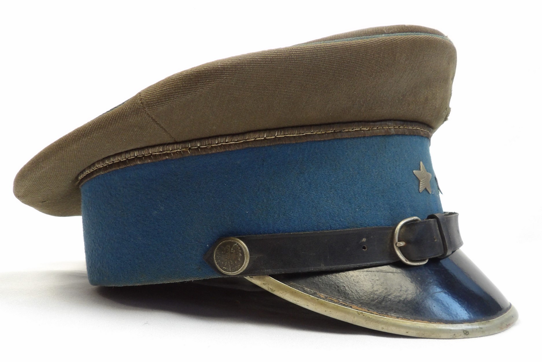 Rzadko notowana czapka z chabrowym otokiem, przeznaczona dla młodszego oficera wojsk lotniczych. Egzemplarz wykonany w 1954 roku. Widoczne punktowe ubytki materiału, zgięcia pierwotnych płaszczyzn, zabrudzenia oraz ślady użytkowania. Obręcz usztywniająca została wymieniona. Na otoku widoczne są trzy gwiazdki. Oryginalne egzemplarze czapek lotniczych z tego okresu są obecnie notowane niezwykle rzadko.