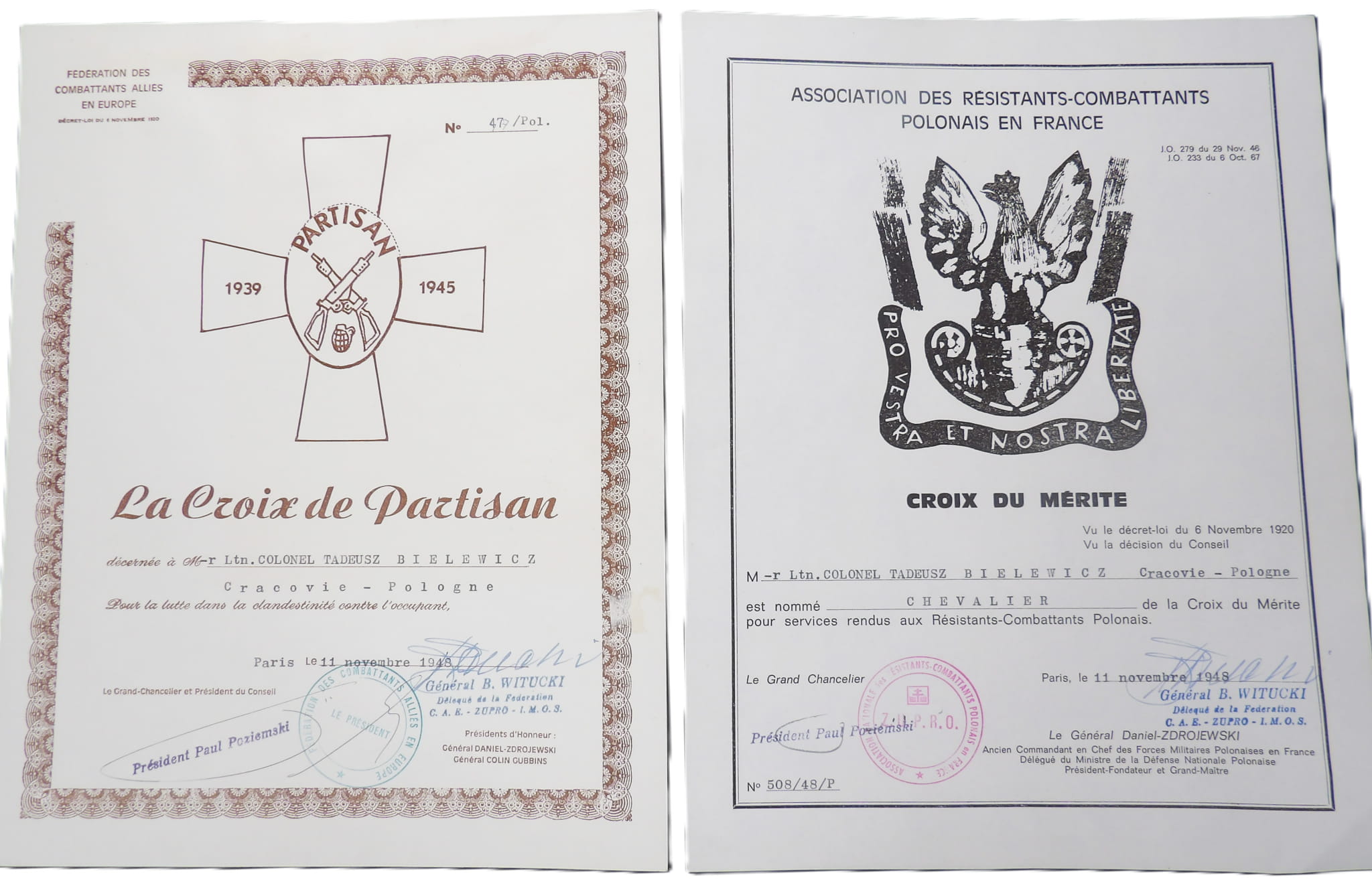 Dwa dyplomy do odznaczeń. Nadane z inicjatywy pułkownika Antoniego Daniela-Zdrojewskiego.