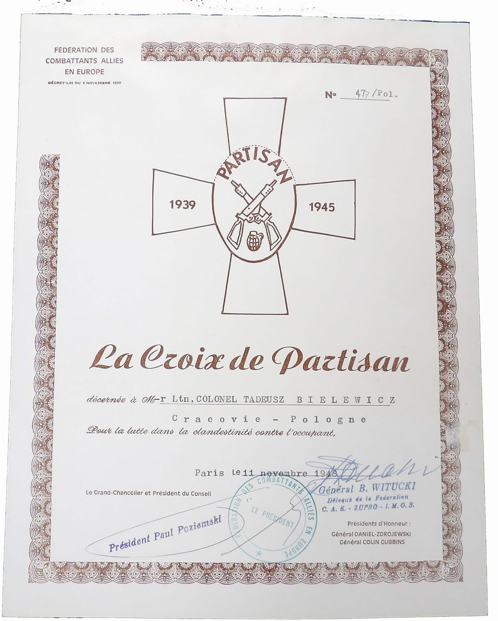 Dyplom do krzyża partyzanckiego.
